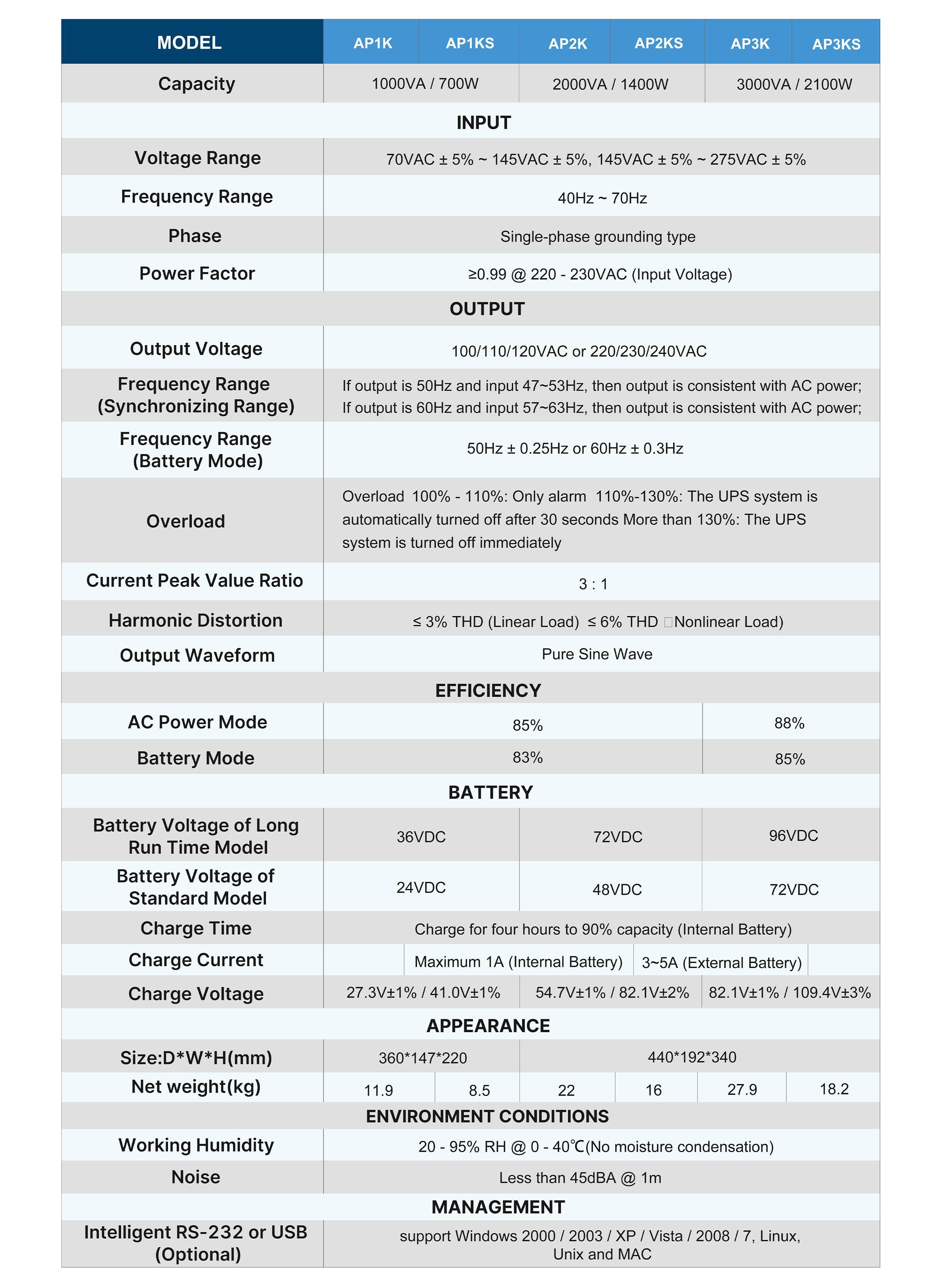 - Optional USB/RS232/RJ45/SNMP Communication Port